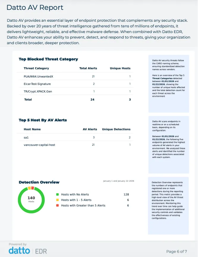 Each report surfaces the top endpoints with the most alerts, the top blocked security threats and an overall detection overview. In one place, you can see which devices are driving the most risk, which threats are being stopped and the general health of your AV coverage - without digging through multiple tools.