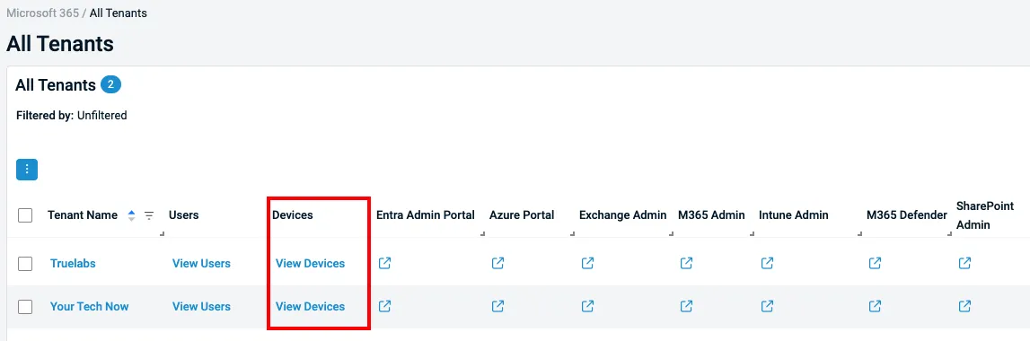 Datto RMM now delivers an improved Intune device management experience, starting with a new View Devices table in the All Tenants view for quicker access to tenant-specific devices.