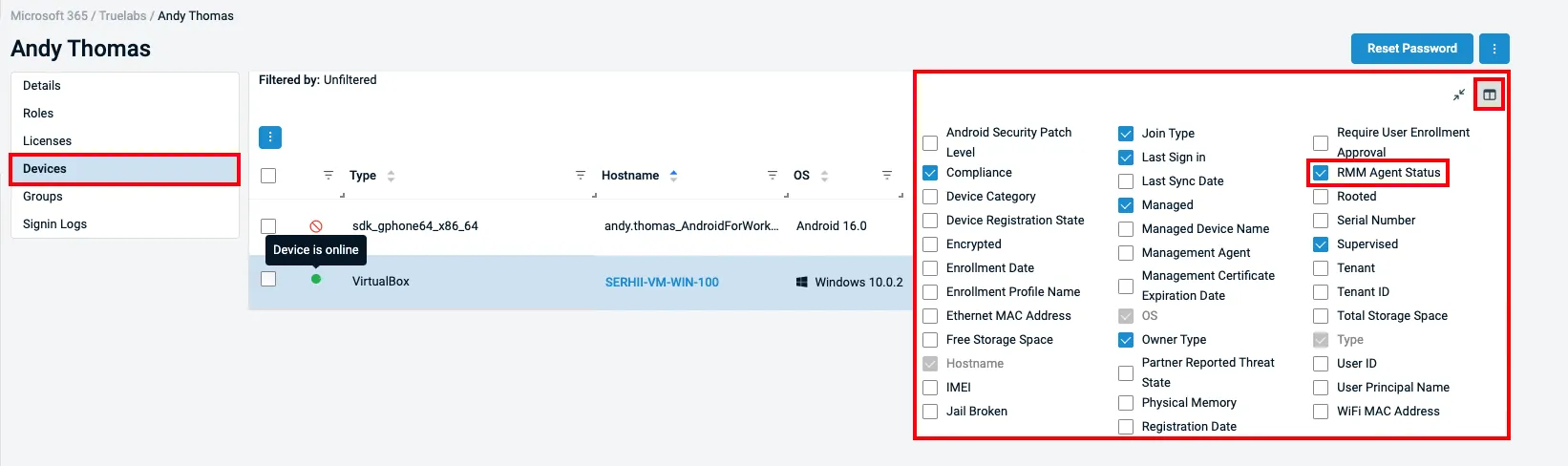 Administrators can also surface the RMM Agent Status column to instantly see whether the Datto RMM agent is installed, online, offline, unsupported or not present on enrolled Windows devices.