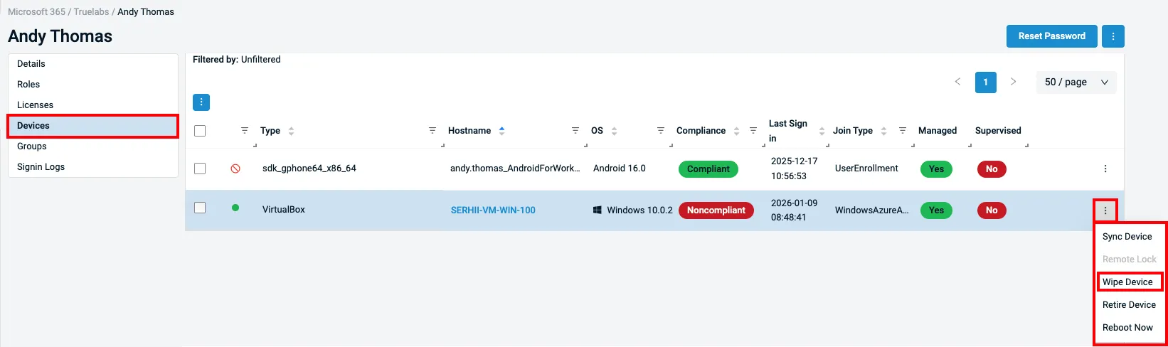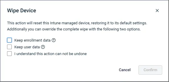 Device actions and visibility have been expanded with additional wipe options that better match real-world recovery and deprovisioning scenarios, including preserving enrollment data or user data when resetting devices.