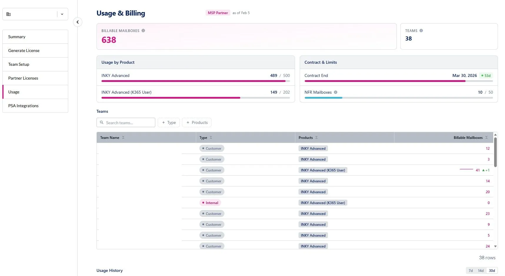 Inky now includes a dedicated Usage & Billing page for Kaseya partners and direct customers, providing real-time visibility into mailbox counts, contract health and product allocation — all without leaving the INKY dashboard.