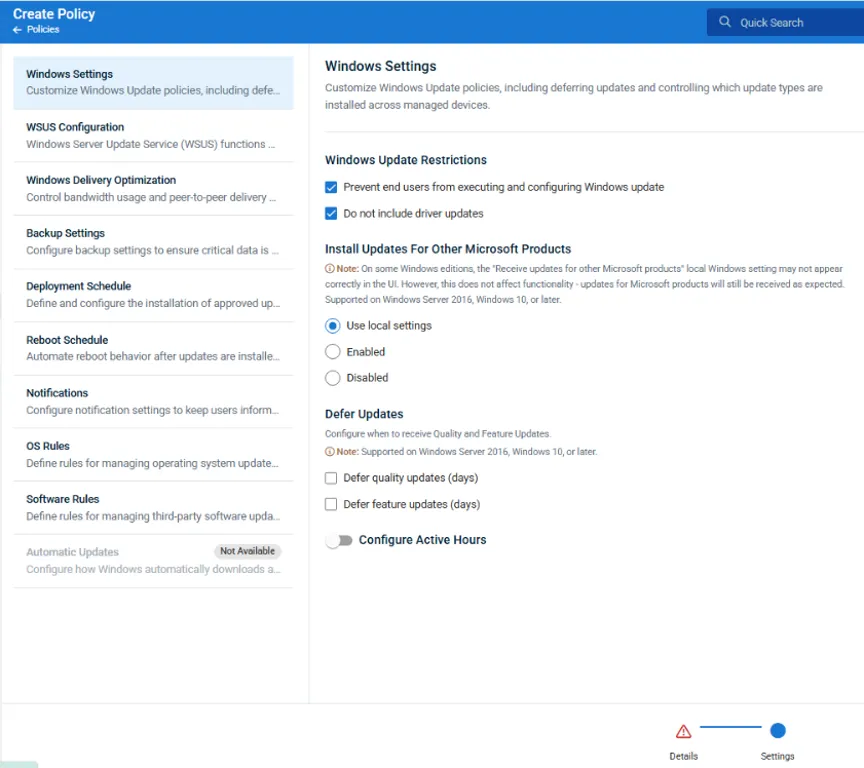 The Patch Management policy form in Kaseya VSA 10 has been redesigned to provide a clearer, more logical configuration experience for administrators. Settings are now organized into well-defined sections, making it easier to understand, navigate and manage patch policies with confidence.